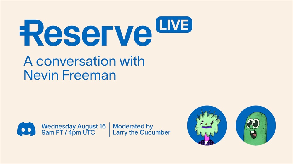 On august 16 at 9am PT, Reserve co-founder Nevin F🅡eeman 👾 will have a LIVE conversation with the community moderated by Larry the Cucumber on Discord.