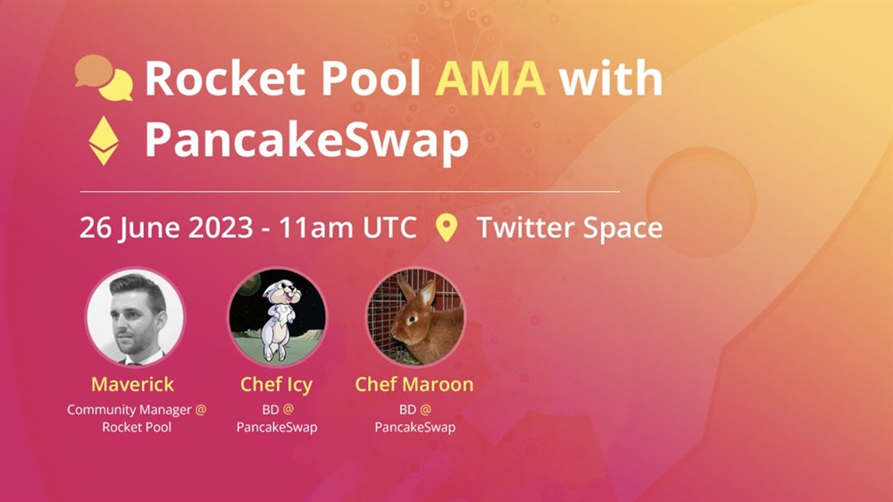 Rocket Pool will have an AMA on Twitter with representatives from PancakeSwap to chat about their work with the Rocket Pool Protocol DAO Incentives Management Committee & what that means for liquid stakers.