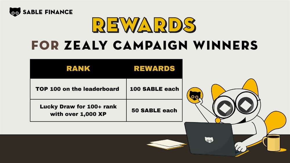 Sable has announced the rewards for the Zealy Campaign. The leaderboard snapshot will be taken on August 11, 2023, at 8:00 UTC. The top 100 participants on the leaderboard at that time will each receive 100 Sable tokens.