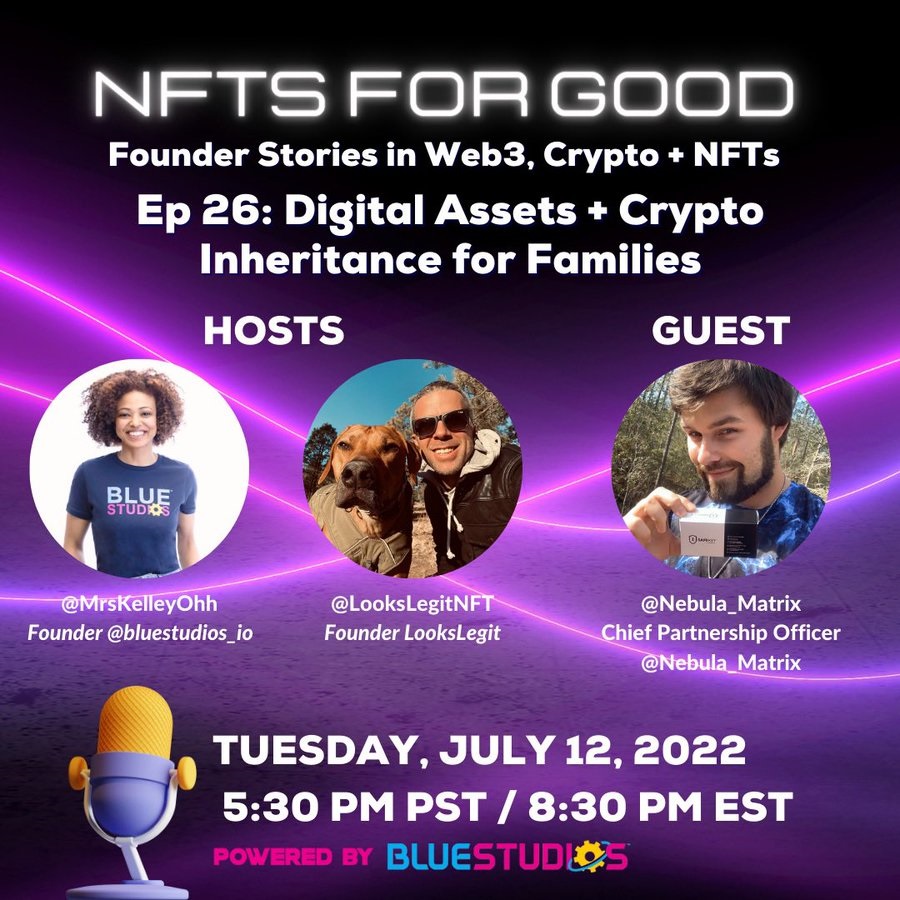 @MrsKelleyOhh, @LooksLegitNFT, and @Nebula_Matrix will be discussing the integration of @Inheriti_com within @BlueStudios_io upcoming family #DeFi Wallet 👀👨👩👧👦🛡