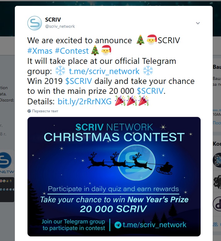 Join to the quiz at SCRIV Telegram community and win 2019 coins daily. Сompete for the main price of 20 000 SCRIV.
