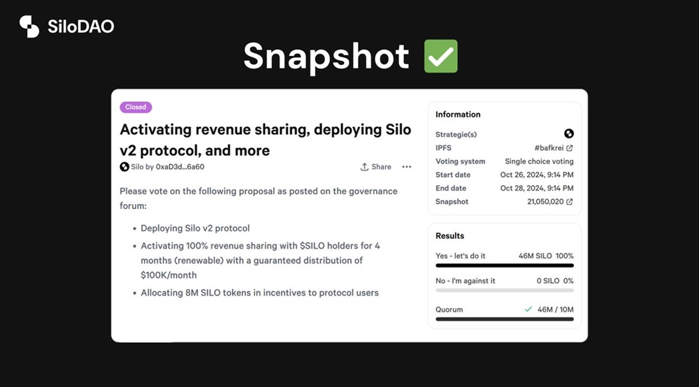 The Snapshot proposal regarding SILO revenue sharing, Silo v2-α and user incentives has passed and will be executed within 7 days time.