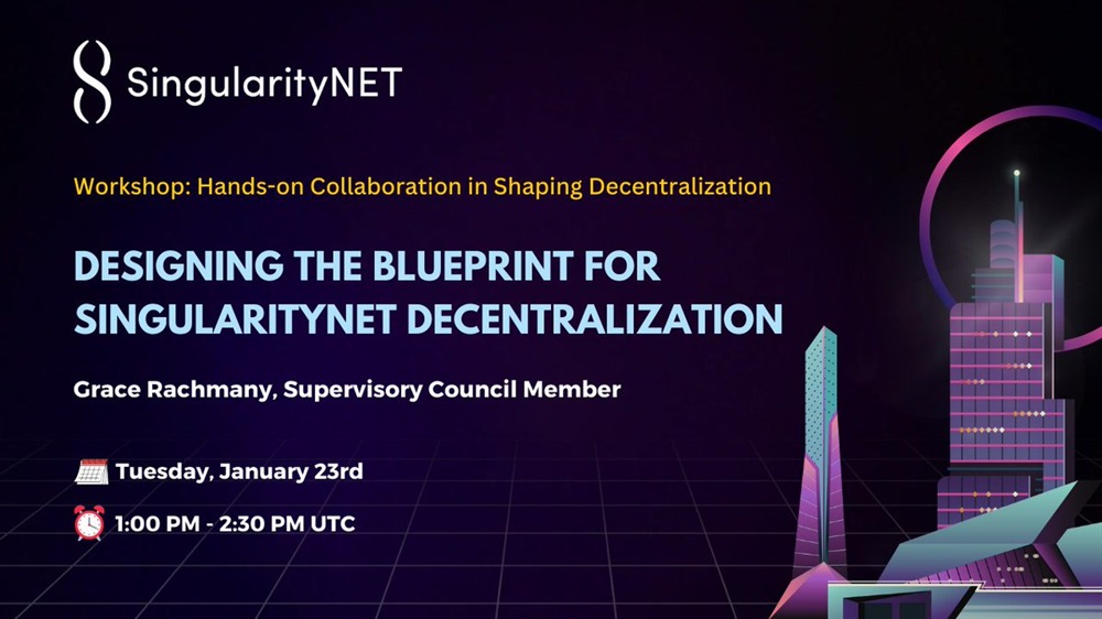 Join us this tuesday, january 23rd, 2024, at 13:00 UTC for the third session of the "Designing the Blueprint for SingularityNET Decentralization" workshop series!