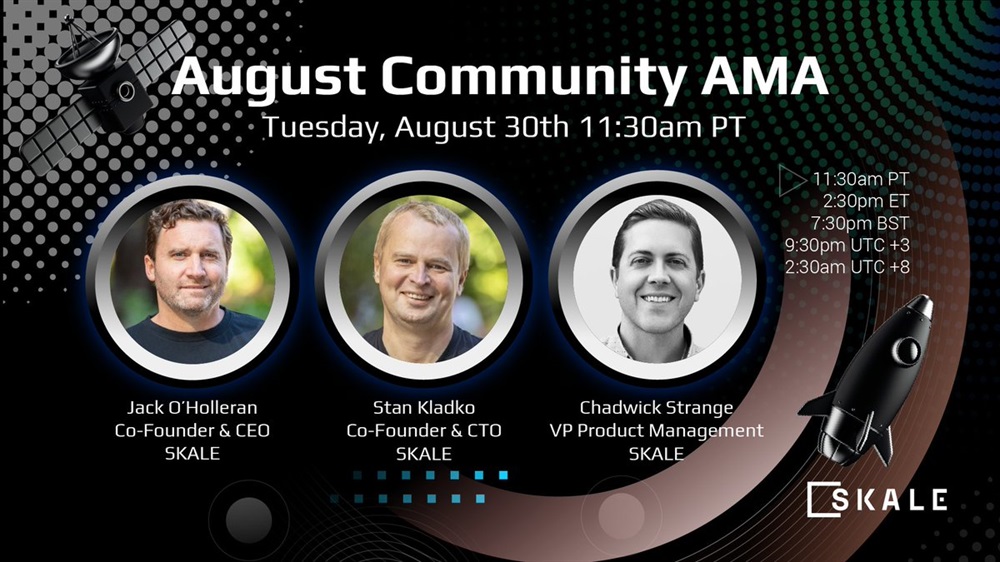 Calling all #Skaliens! Join us Tuesday, August 30 at 11:30a PT/2:30p ET for our next Community AMA, with @jackoholleran, @Stan_Kladko and @ChadwickStrange answering YOUR questions! 👽🚀✌️