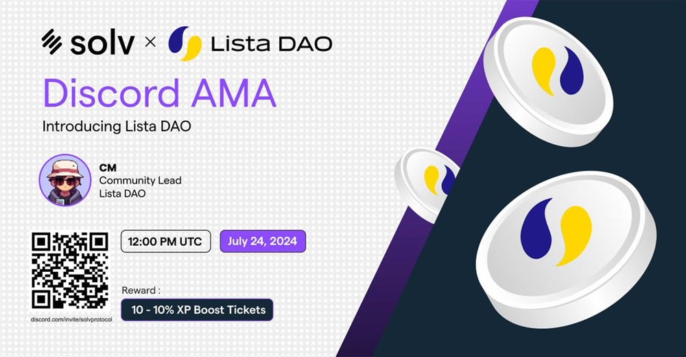 Solv Protocol will host an AMA on Discord on July 24th at 12:00 PM UTC. The event will feature a discussion with the community lead of ListaDAO. The focus of the discussion will be on how to maximize SolvBTC with ListaDAO.