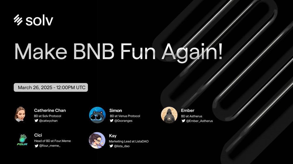 Solv Protocol will host an AMA on X on March 26th at 12:00 pm UTC. The conversation will delve into the impact of memes on the crypto industry, the strategies for building strong communities, and the potential of SolvBTC.BNB.