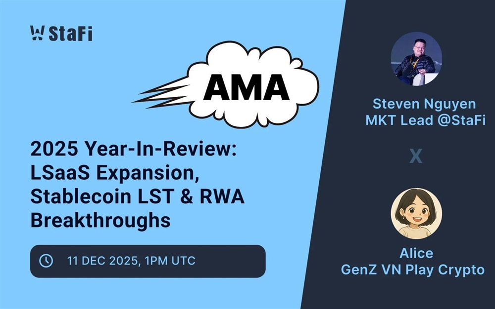 Stafi will host an AMA on X titled “2025 Year-in-Review: LSaaS Expansion, Stablecoin LST and RWA Breakthroughs” on December 11th at 13:00 UTC. The session will outline progress in liquid staking as a service, stablecoin-based liquid staking tokens and real-world asset integrations, with 2,000 FIS allocated as rewards.