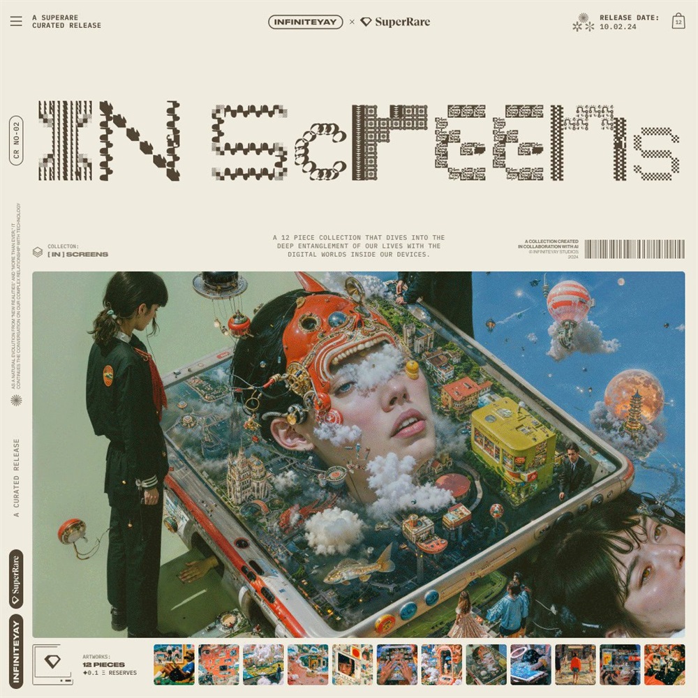 SuperRare is set to release a curated series titled “In Screens” by INFINITEYAY. This series consists of 12 unique pieces that delve into the intricate relationship between our lives and the digital worlds encapsulated within our devices. The release is scheduled for October 2nd. Each piece in the series is a 1/1, indicating that they are unique and not part of a larger edition.