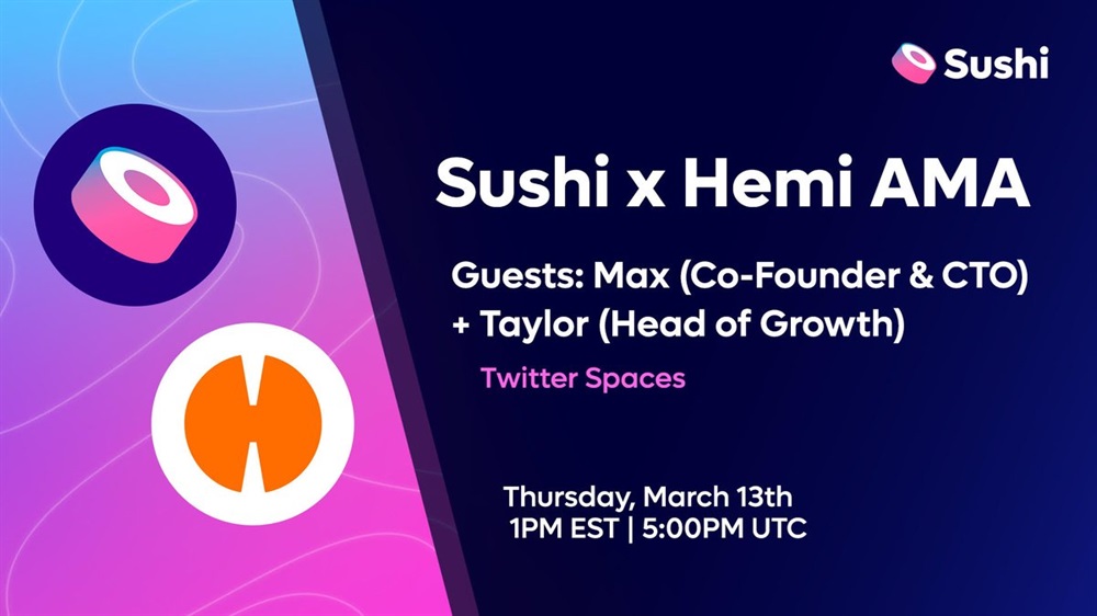 Sushi will host an AMA on X with Hemi Network on March 13th at 18:00 UTC to discuss their latest integration.