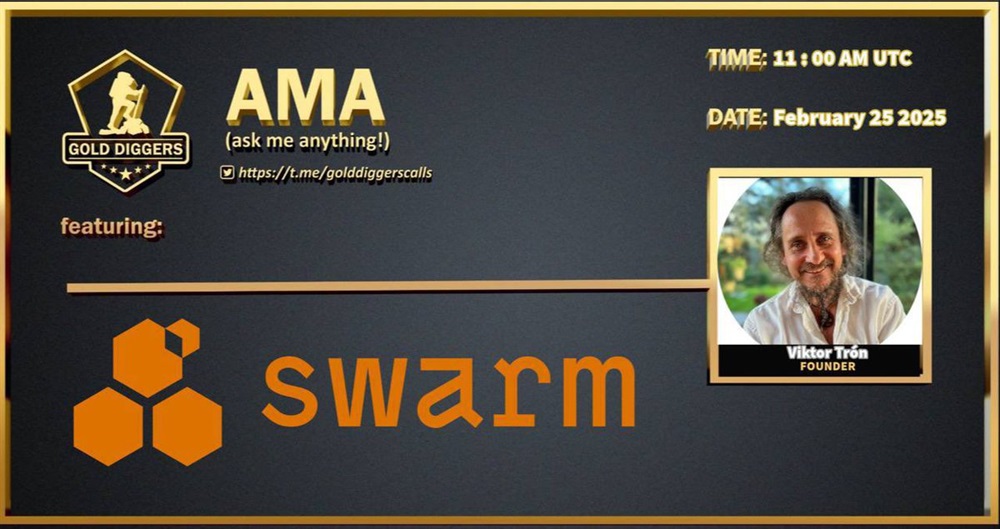 Swarm will participate in an AMA on Telegram hosted by GOLDDIGGERS. The session is scheduled to take place on February 25th starting at 11:00 AM UTC.