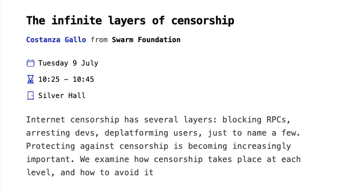 Swarm is participating in the Ethereum Community Conference in Brussels on July 9th. The talk will delve into the workings of internet censorship, including the blocking of RPCs, arrests of developers, and deplatforming of users.
