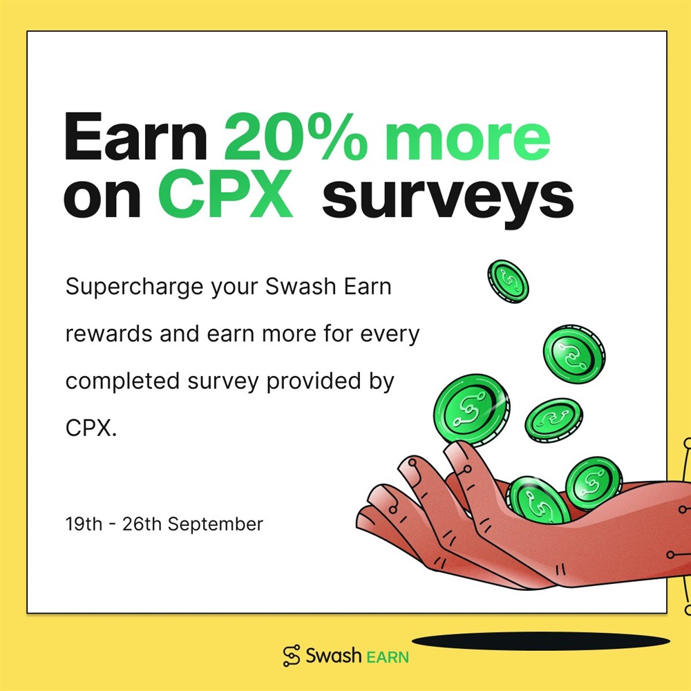 Swash has announced a new development in their partnership with CPX Research. From September 19th till 26th, users who complete CPX research surveys through Swash earn will receive an additional 20% reward for every successful survey they complete.