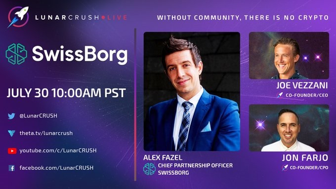 Can't wait to see our CPO, @alex_fazel, discuss #SwissBorg with @LunarCRUSH TONIGHT, July 30th at 7PM CET on @LunarCRUSH Twitter or on their YouTube channel: youtube.com twitter.com