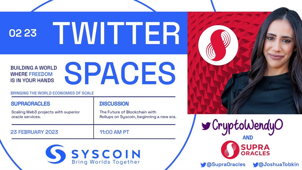 Join the next #Syscoin Twitter Space with the amazing @CryptoWendyO & @JoshuaTobkin CEO of @SupraOracles!