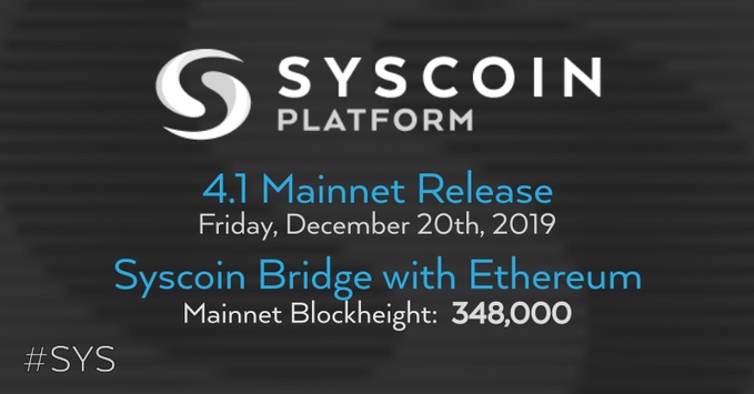 Great news! Syscoin 4.1 will be released this Friday, December 20th, and Syscoin Bridge Mainnet will be live at block 348,000, making #interoperability between @Syscoin and @Ethereum a reality. #scaling