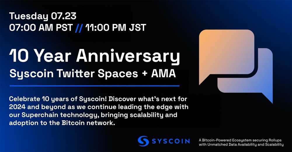 Syscoin will host an AMA on X on July 23rd at 14:00 UTC. The event will provide insights into the plans of Syscoin for 2024 and beyond.