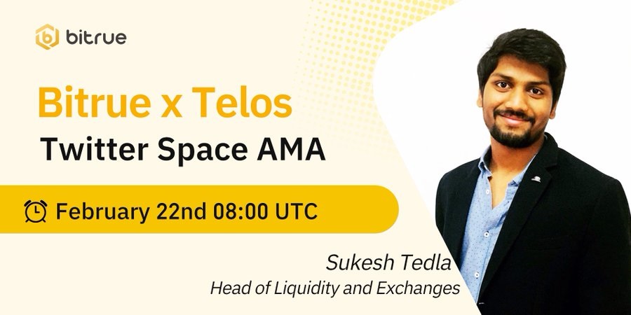 Set your reminders for our upcoming Twitter Spaces with @BitrueOfficial, featuring #Telos' Head of Liquidity and Exchanges @sukeshtedla!
