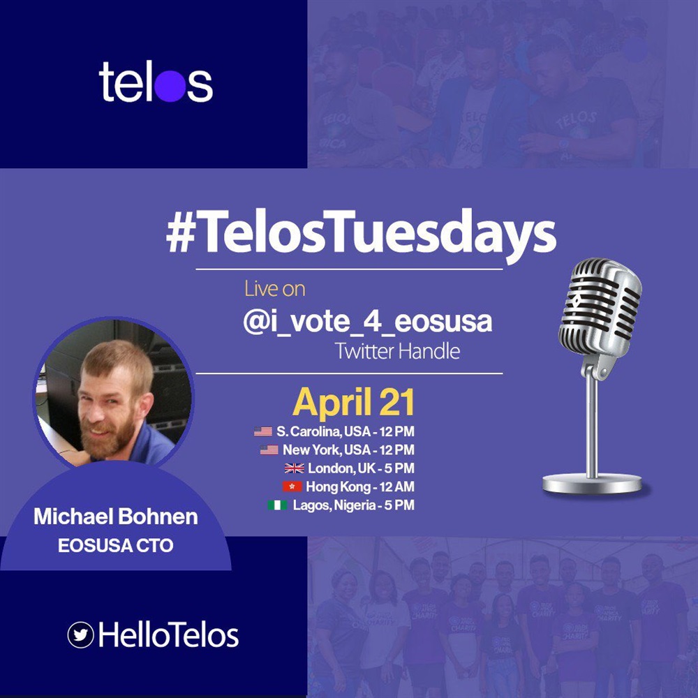 🗣 Join us for another #TelosTuesdays Live Twitter #AMA with a block producer of Telos, CTO Michael Bohnen of EOSUSA @ivote4_eos_usa