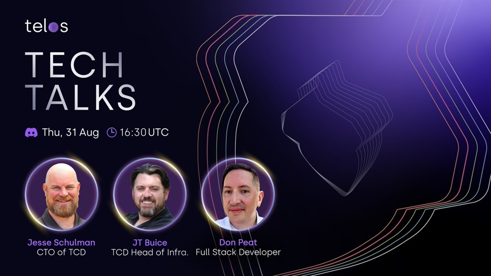 Tune in for the latest Telos Network developments in our upcoming #TelosTechTalks, hosted August 31st in the Telos Discord! Ft. Telos Developers - Jesse 🟣, J.T. Buice, and Special Guest, Don Peat!
