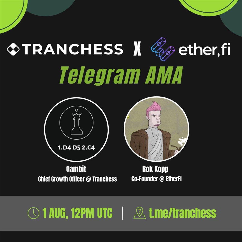 Tranchess will host an AMA on Telegram with the co-founder of EtherFi. The discussion will focus on EtherFi and the new eETH funds. The event is scheduled to take place on August 1st at 12 pm UTC.