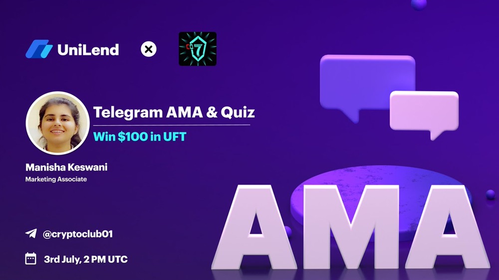 UniLend Finance will host an AMA on Telegram with Crypto 0. Seven on the 3rd of July at 14:00 UTC. The session will feature a discussion with Manisha Keswani, marketing associate manager, about UniLendV2, Numa Chain, and the plans of the organization.