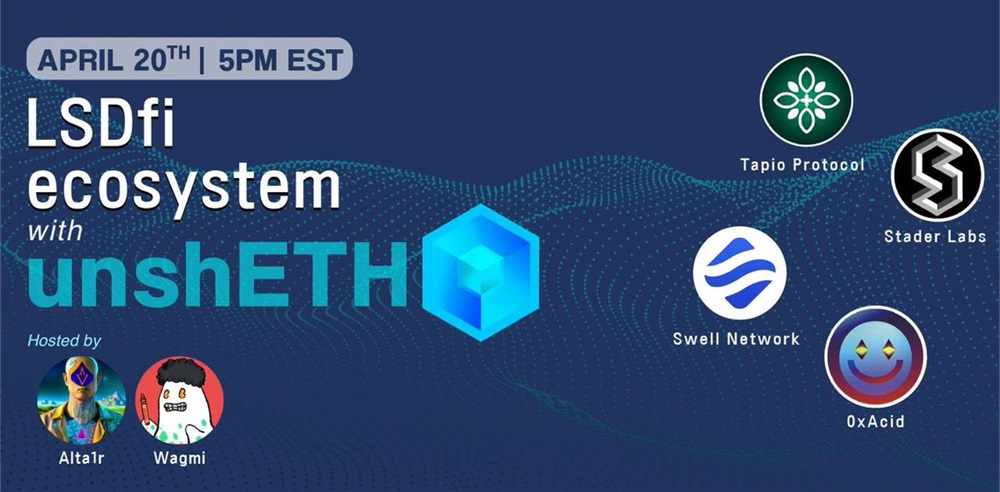 Join us on Thursday at 5pm ET for the first LSDFi Ecosystem Spaces with unshETH featuring @staderlabs_eth @TapioProtocol @0xAcidDAO @swellnetworkio hosted by @EIP_Alta1r @wagmi33. Set a reminder 👇
