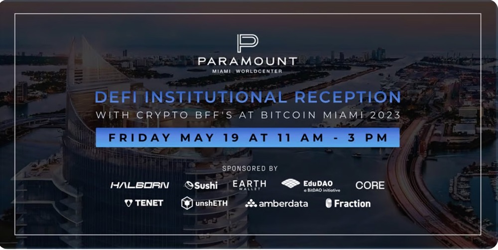 Join us tomorrow May 19 from 11-3pm EST at DeFi Institutional Reception w/Crypto BFF's at Bitcoin Miami 2023!