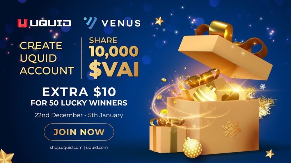Uquid Coin is collaborating with Venus Protocol for a Christmas Rewards Unlock Campaign. The campaign features a prize pool of 10,000 VAI tokens. For every Uquid Shop account, 1 VAI token will be unlocked. Additionally, 50 fortunate participants will receive an extra gift of $10 each. The campaign is scheduled to run from December 22nd to January 5th.