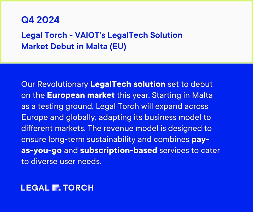 Vaiot’s flagship product, Legal Torch, is scheduled to launch in Malta in November. The company plans to expand its presence into other EU countries by 2025.