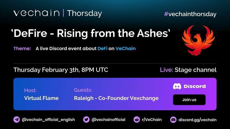 @TheVirtualFlame will be joined by @Raleigh_CA for a session titled: "DeFire - Rising from the Ashes" discussing the future of #DeFi on #VeChain!