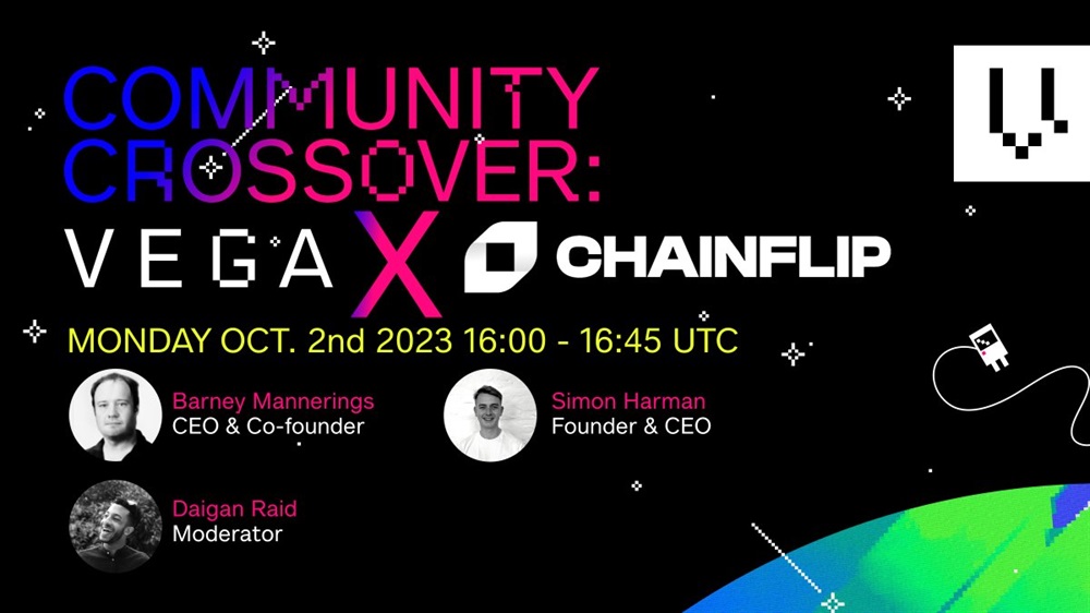 Vega Protocol is set to host its first Community Crossover event with Chainflip Labs. The event is scheduled for October 2nd, at 16:00 UTC, and the speakers will be Barney Mannerings, CEO and co-founder of Vega Protocol, Simon Harman, founder and CEO of Chainflip Labs, with Daigan Rad serving as the moderator.