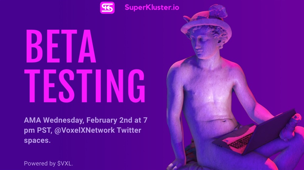 Wednesday, Feb 2nd, 2022 Tune into Twitter Spaces at 7pm PST for an exclusive AMA @VoxelXnetwork X @SuperKluster NFT Marketplace Beta Testing & Roadmap to Product Launch!