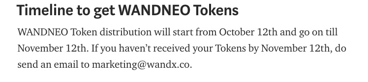 Timeline to get WANDNEO TokensWANDNEO Token distribution will start from October 12th and go on till November 12th. If you haven’t received your Tokens by November 12th, do send an email to [email protected].