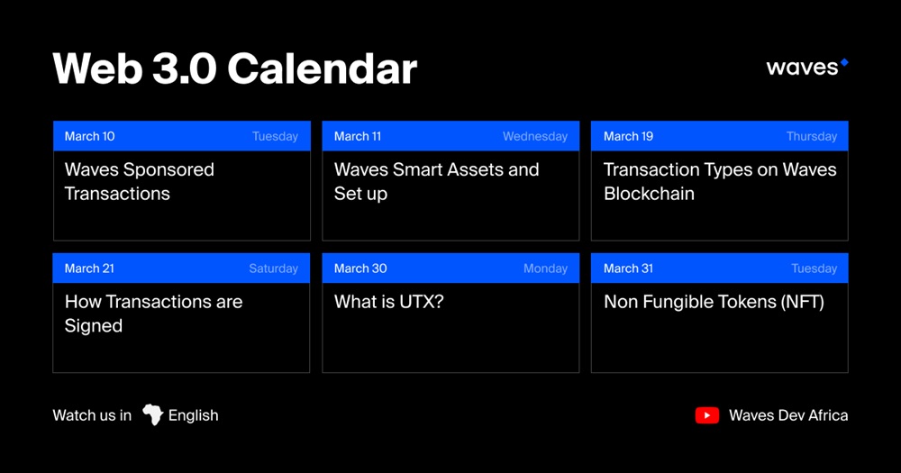 #Waves community never sleeps🌏💻@waves_africa has prepared a new batch of tutorials for #developers in English. Check out March's schedule and don't forget to subscribe to their Youtube channel👉youtube.com