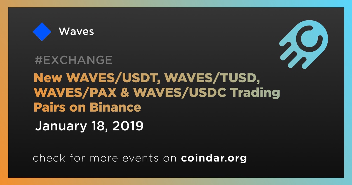 Binance will open trading for WAVES/USDT, WAVES/TUSD, WAVES/PAX and WAVES/USDC trading pairs at 2019/01/18 10:00 AM (UTC).
