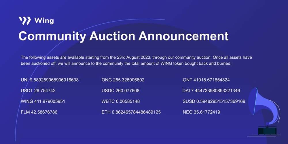 Wing Finance will host a community auction on the 23rd of August. The auction will be exclusively accessible via the ONTO Wallet — Web3 gateway. It is important to note that half of the revenue generated from this auction will be utilized to buy back and burn WING tokens.