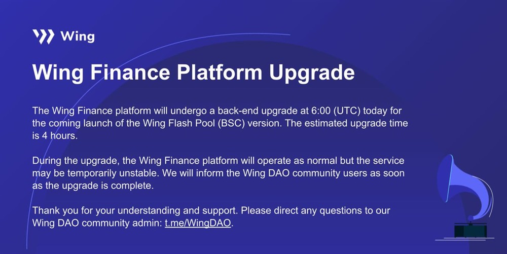 Our platform will undergo a back-end upgrade👇 at 6:00 (UTC) today for the upcoming #Wing #FlashPool (#BSC) launch. @BinanceChain