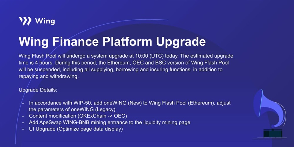 Our platform will undergo a back-end upgrade👇at 10:00 (UTC) today for #Wing #FlashPool system upgrade.