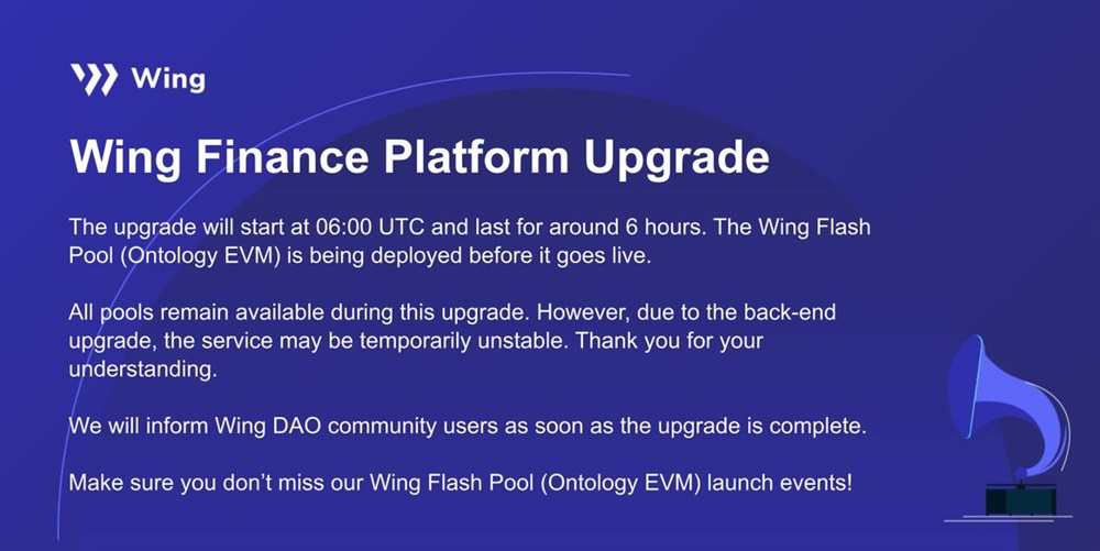 Our platform will undergo a back-end upgrade at 6:00 (UTC) today for the upcoming #Wing #FlashPool (#OntologyEVM) launch - @OntologyNetwork