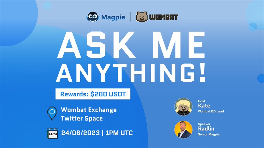 Wombat Exchange will host an AMA with Magpie on August 24th at 1 pm UTC. The discussion will revolve around the recent WOM UP party and future plans for the Wombat ecosystem.