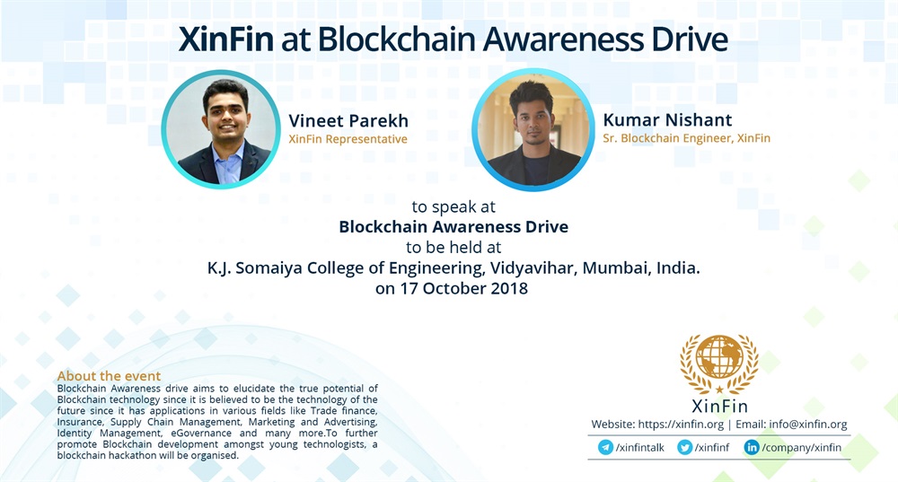 Vineet Parekh , XinFin Representative & Kumar Nishant , Sr. Blockchain Engineer, XinFin to speak at Blockchain Awareness Drive to be held at KJ Somaiya College of Engineering, Vidyavihar, Mumbai, India on Oct 17.