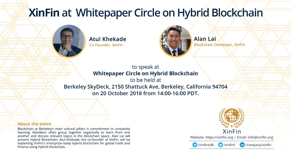 Atul Khekade , Co-Founder & Alan Lai, Blockchain Developer XinFin to speak at Whitepaper Circle on Hybrid Blockchain hosted by Blockchain at Berkeley, held at Berkeley SkyDeck, 2150 Shattuck Ave, Berkeley, California on 20 Oct 2018 from 14:00-16:00 PDT.