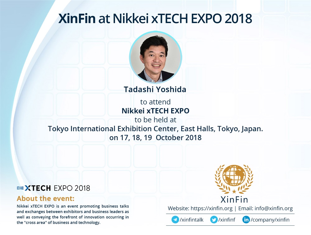 @tashiten_tad, Ecosystem development Japan, @XinFinF to attend @NIKKEIxTECHEXPO held at #TokyoInternationalExhibition Center, #Tokyo, #Japan on 17, 18, 19 october 2018. Meet Tadashi at the #event to understand the #working, #usecases & #development of #XinFin.