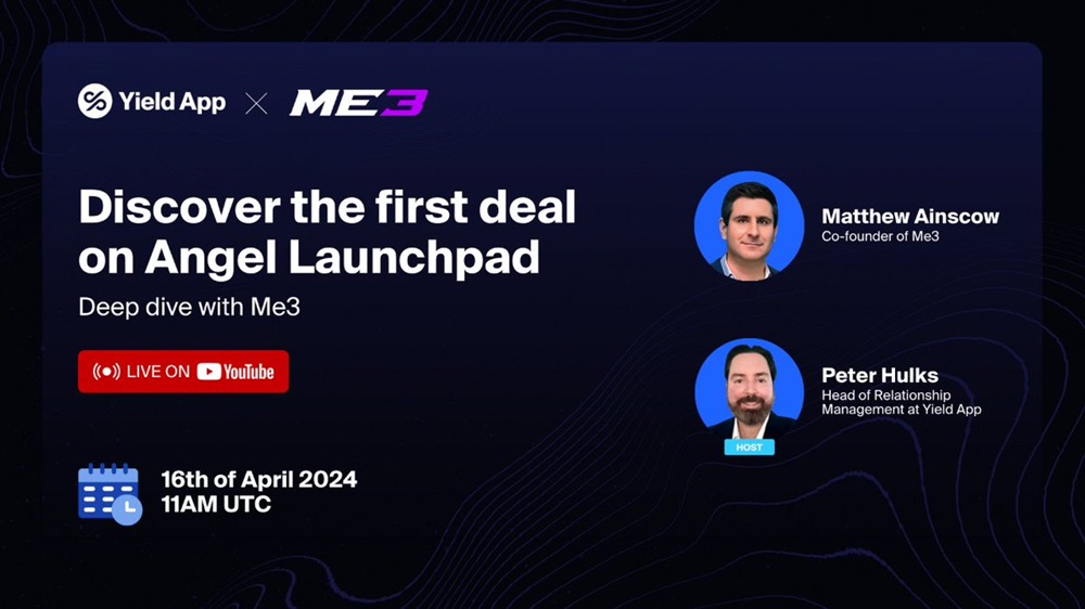 YIELD App will host a live stream on YouTube with Matthew Ainscow, the co-founder of Me3. This session is scheduled for the 16th of April at 11:00 UTC.