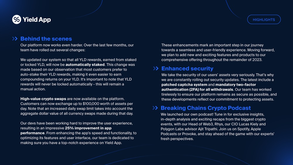 Our first quarterly report of 2023 is now live, highlighting our key achievements and major milestones. Plus, get an exclusive peek behind the scenes to understand the factors that have contributed to Yield App’s success today 🏆📊