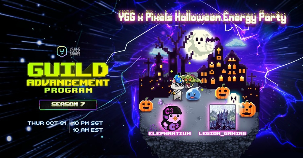 Yield Guild Games is hosting a Halloween Energy Party on Discord in collaboration with Pixels on October 31st at 10:00 UTC. The annual event brings together the Yield Guild Games and Pixels communities.