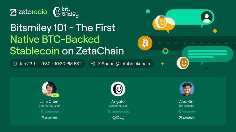 ZetaChain will host an AMA on X with bitSmiley on January 24th at 10:30 am UTC. The discussion will revolve around the first-ever native BTC-backed stablecoin on ZetaChain.
