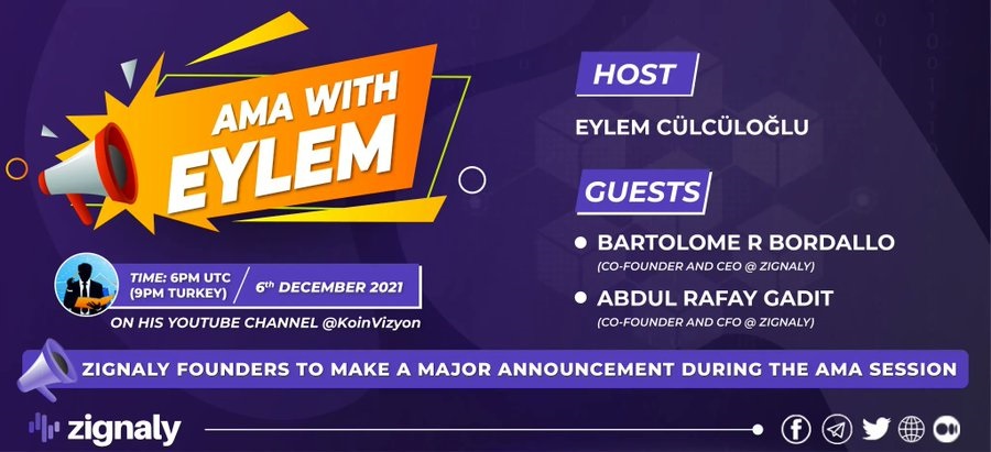 @EylemCulculoglu will be hosting an AMA with Zignaly cofounders, @brbordallo and @ARafayGadit on 6th December, 18:00 UTC (21:00 Turkish time)
