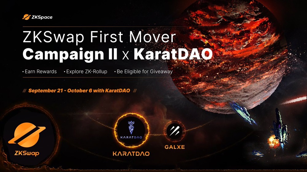ZKSpace is launching a first mover campaign in collaboration with KaratDAO. The campaign will be hosted on the ZKSwap platform. The campaign is set to start on September 21st at 0:00 UTC and will run until October 6th at 0:00 UTC.