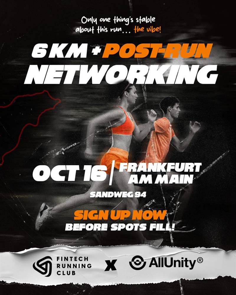 AllUnity EUR will conduct an evening run and networking session for the fintech community in Frankfurt on October 16th from 17:30 to 18:30 UTC.